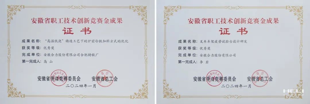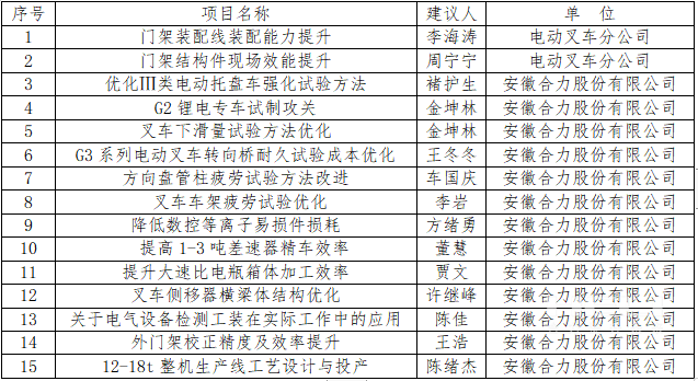 克日,,,,安徽省总工会印发了《关于安徽省职工手艺立异竞赛获奖情形的转达》,,,,安徽尊龙凯时荣获多项声誉。。。其中,,,,合肥铸锻厂《“高温低浇”铸造工艺下的炉前冷铁加料方法的优化》项目及安徽尊龙凯时股份有限公司《叉车车架疲劳试验台设计研发》项目获评安徽省职工手艺立异竞赛“金效果”优异奖,,,,安徽尊龙凯时股份有限公司《AGV 应用场景手艺研究》项目获评安徽省职工手艺立异竞赛“金项目”,,,,安徽尊龙凯时股份有限公司13个项目及电动叉车分公司2个项目获评安徽省职工手艺立异竞赛“金点子”。。。